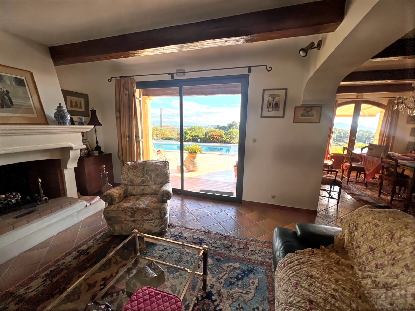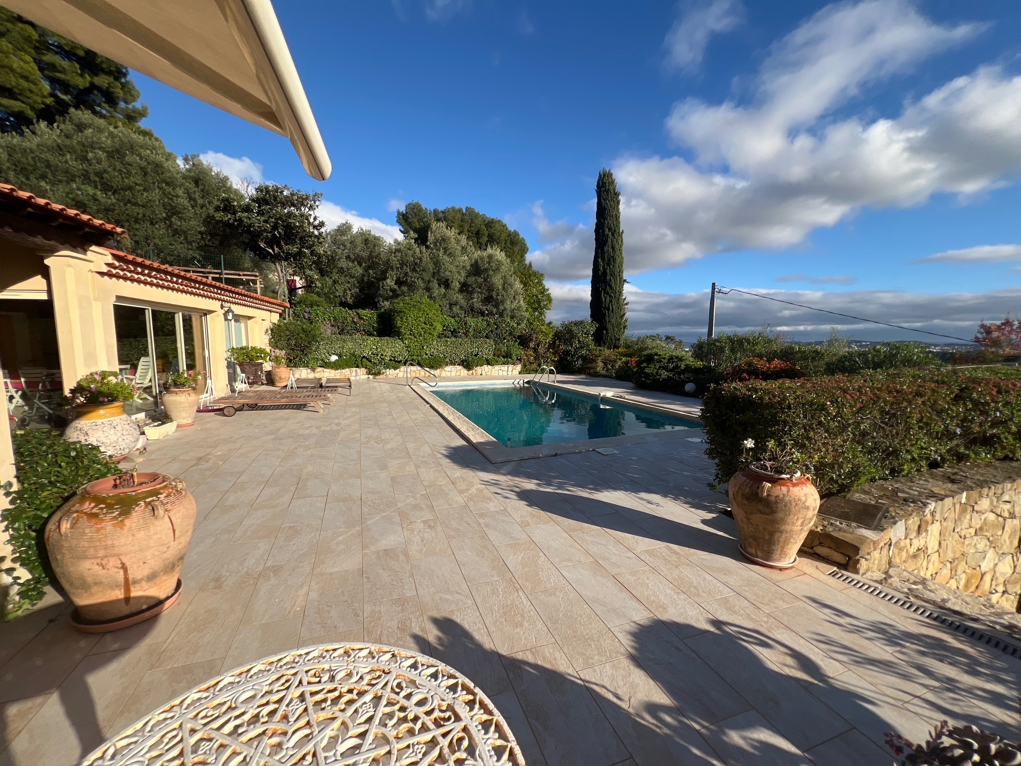 OLLIOULES- Située sur les hauteurs avec vue dominante et mer, belle villa construction traditionnelle avec prestations de qualité. On accède à cette maison par une entrée qui dessert salle à manger/salon avec cheminée de 49 m², toilettes, cuisine aménagée, buanderie. En demi-étage suite parentale avec sa salle d'eau rénovée, wc, placards, au 1er étage deux chambres, salle d'eau, wc, placards- En rez de jardin une 4ème chambre avec sa terrasse est aussi équipée d'une salle d'eau avec wc, cellier- Grande cuisine d'été de 38 m²- Garage 34 m²- Cave- Terrasse- Piscine 9 X 4. Le tout sur un terrain paysagé de 1960 m²